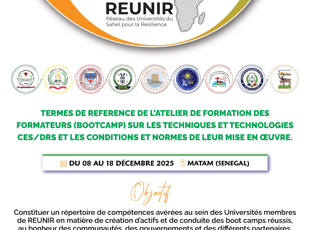 - Renforcer les capacités des participants venant des universités membres de REUNIR (pool d’experts en réalisation de boot camp) en techniques de CES/DRS, en élevage, restauration des paysages, et actions de création d’actifs productifs au niveau des ménages ; qi serviront de relai pour l’implémentation des techniques apprises dans les différents pays ;