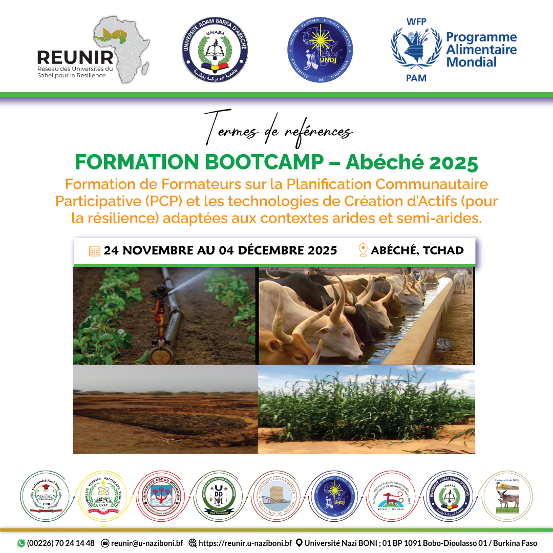 L’objectif principal de la formation est d’améliorer la capacité technique du personnel (Universités, Gouvernement, ONG, etc.) engagé dans la programmation et la mise en œuvre des activités de création d’actifs et de résilience intégrée de disposer de capacités suffisantes pour planifier et organiser des bootcamps dans leur propre pays, et qu’elle puisse également soutenir d’autres pays francophones, à l’intérieur comme à l’extérieur de la région, à partir de fin 2025.